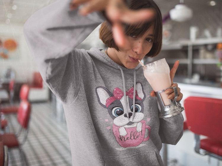 This hoodie sweatshirt features the cutest blue-eyed Boston Terrier girl, wearing a charming pink and white polka-dotted head scarf bow. Inside a pink coffee cup with the word "hello" written on it, surrounded by pink hearts, she exudes charm and adorableness.