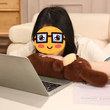 With its floppy ears and charming embroidered face, this plush toy is designed to bring a smile to your face. It rests comfortably on a decorative pillow, making it an ideal addition to your home decor.