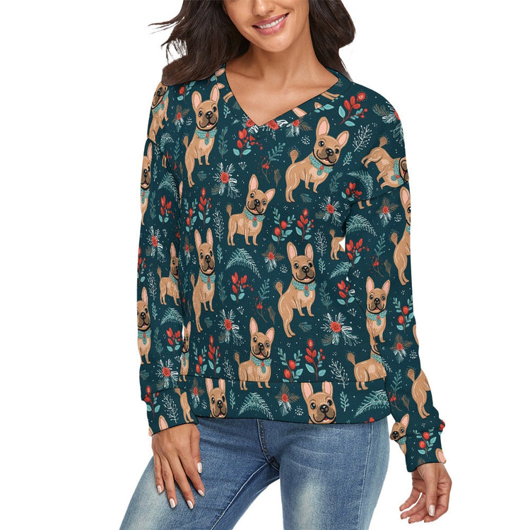 Wrap yourself in festive cheer with our Fawn / Cream French Bulldog Festive Flair Women's V-Neck Christmas Sweater. Adorned with cheerful French Bulldogs, each grinning widely and sporting a decorative collar, this sweater is a joyful addition to your holiday wardrobe.