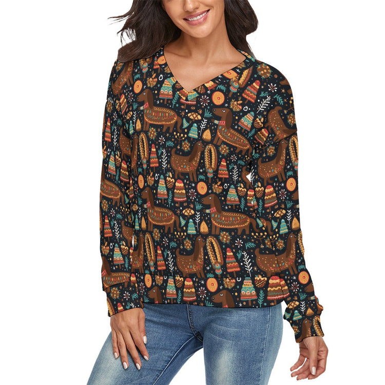 Embrace the holiday season with flair in the Festive Chocolate Dachshund Delight Women's V-Neck Christmas Sweater.