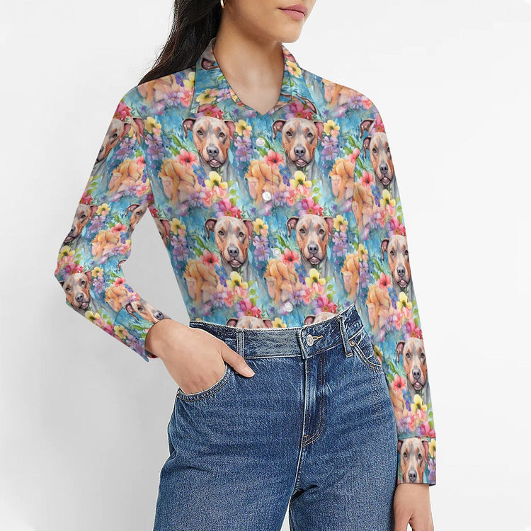 Embrace the warmth and vivacity of both nature and canines with our Floral Cascade Red Brindle Pit Bull Women's Shirt, available in two mesmerizing designs.