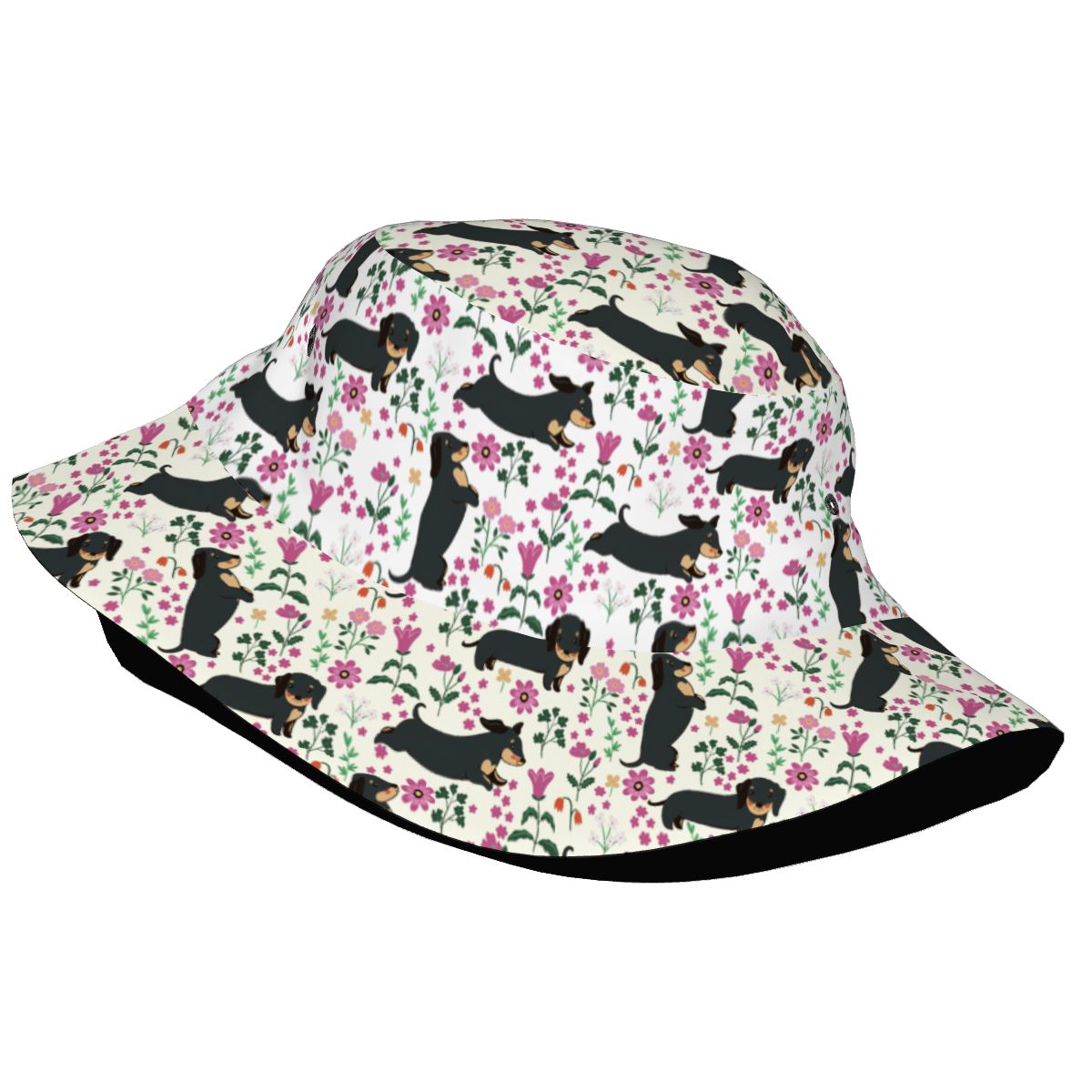Bring sunny-day style to life with the Flower Garden Black Dachshund Bucket Hat.