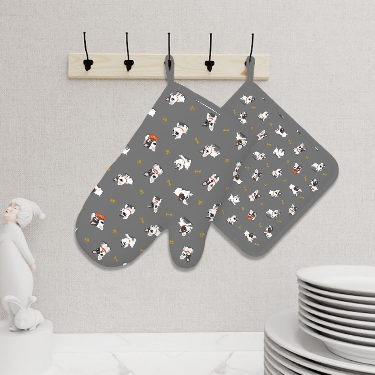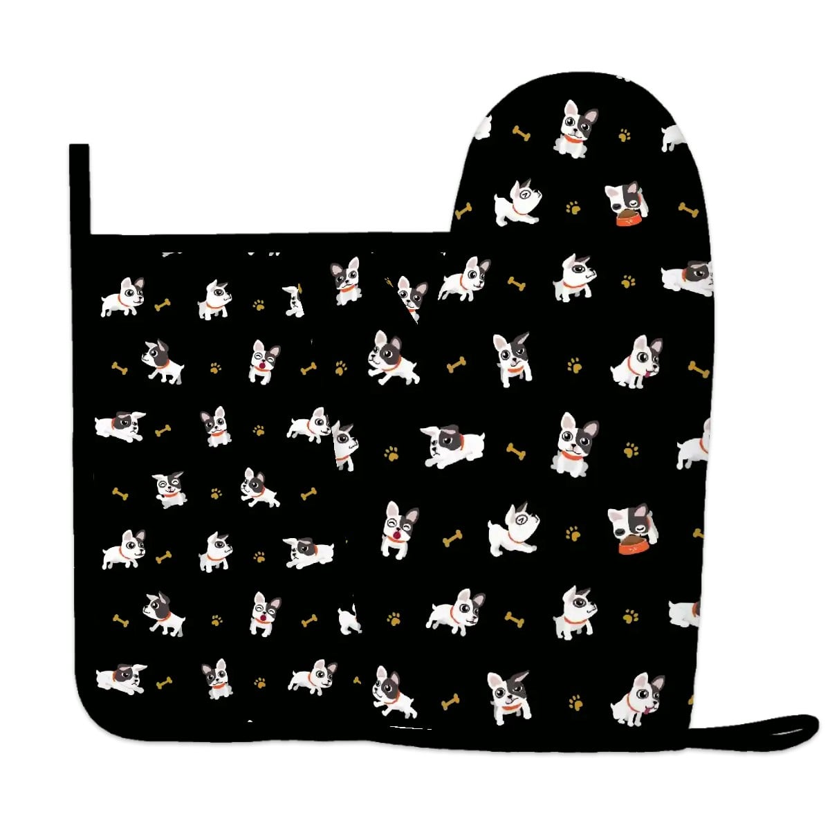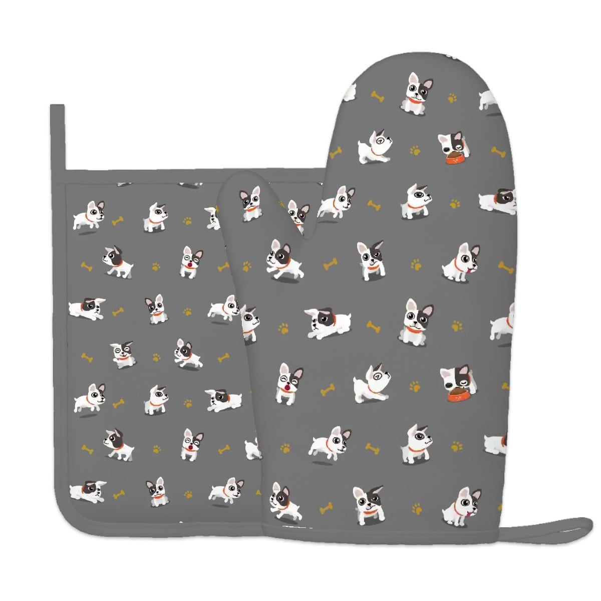 Add a pinch of puppy love to every meal with this adorable French Bulldog oven mitt and pot holder set.