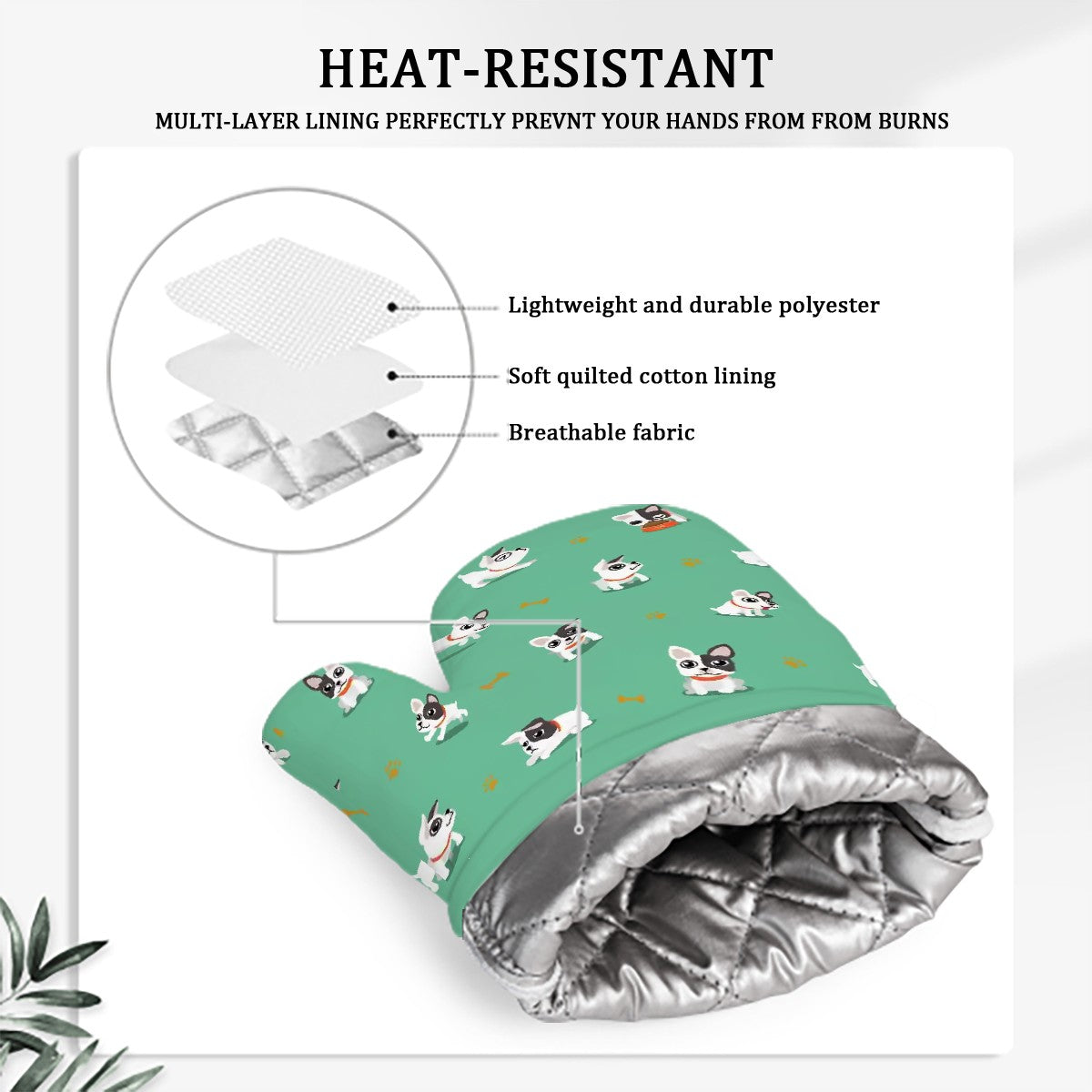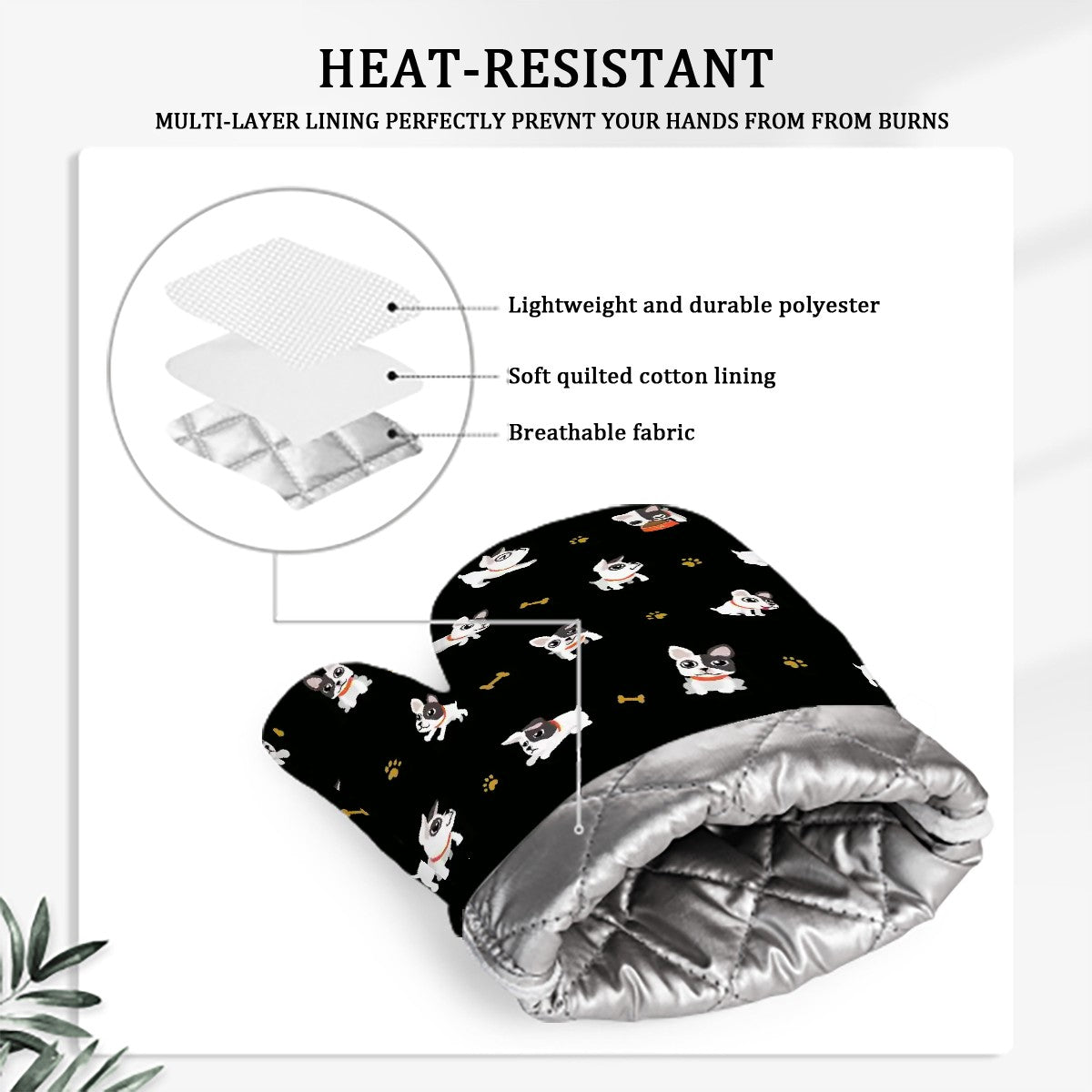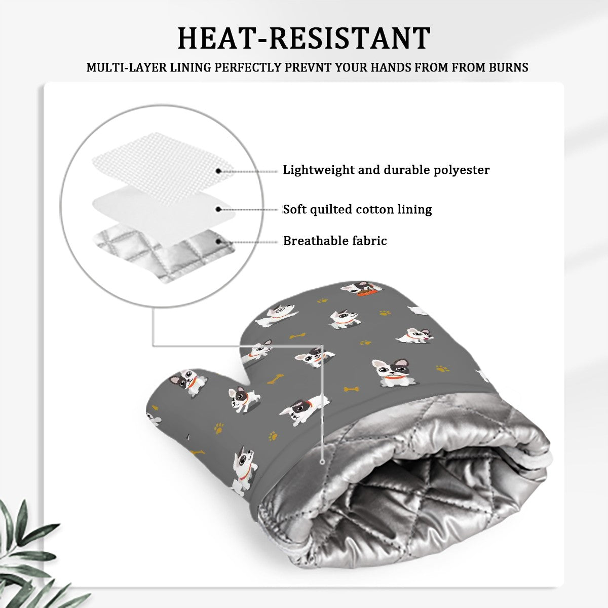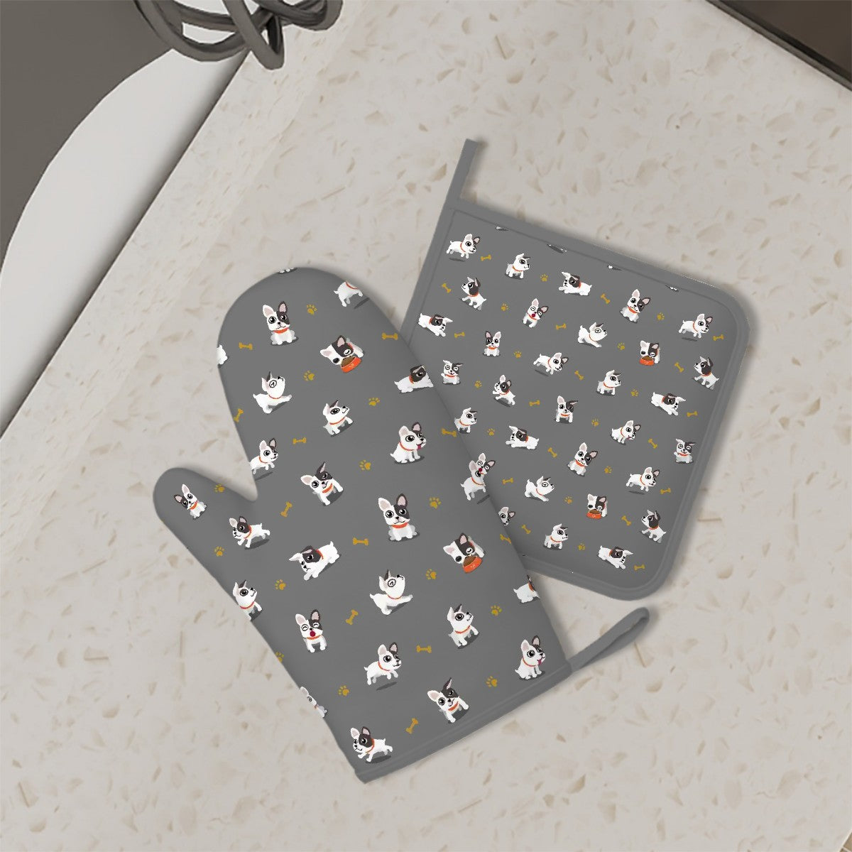 These heat-resistant accessories are perfect for handling hot pots or baking sweet treats. The non-slip silicone palm ensures a safe grip while you flaunt your French Bulldog loving personality.