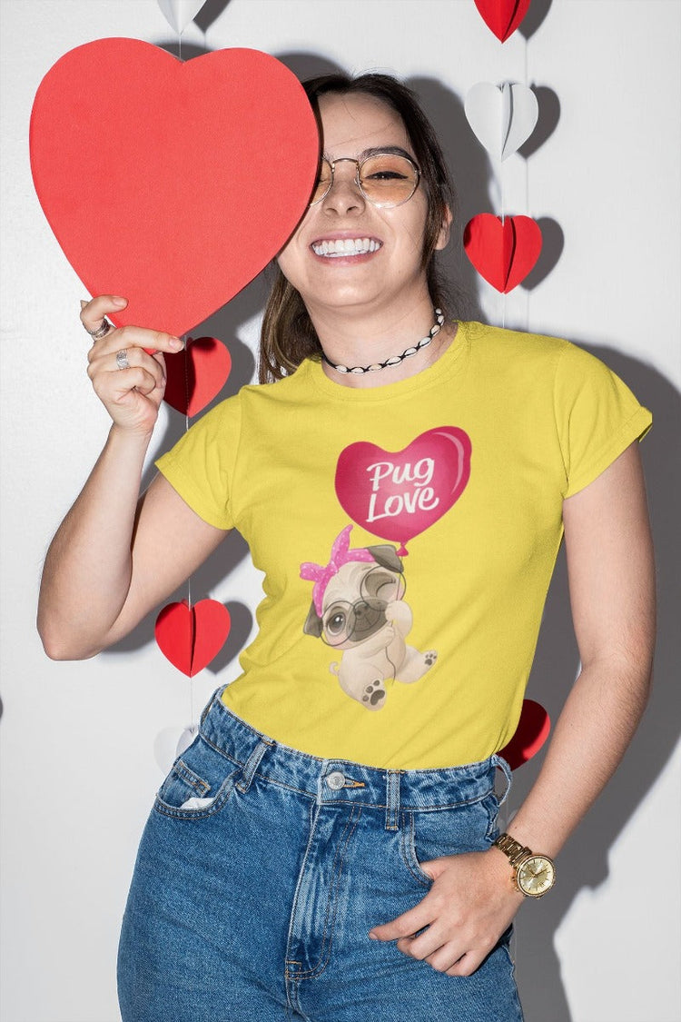 Featuring a delightful girl Pug holding onto a red heart-shaped balloon with the text "Pug Love" written on it, this t-shirt is a perfect expression of your affection for these furry friends. Available in five vibrant colors, including white, black, yellow, green, and blue, this t-shirt allows you to choose the shade that resonates with your personal style.