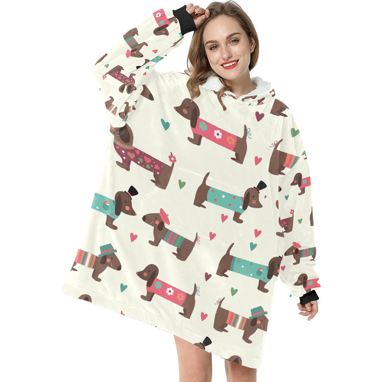 Hand Drawn Chocolate Dachshunds in Love Blanket Hoodie for Women - 5 Colors