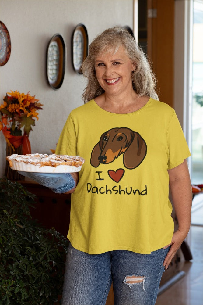 The accompanying text "I ❤️ Dachshund" boldly showcases your devotion and serves as a heartwarming declaration of your love for this beloved breed. Available in five vibrant colors, including Yellow, White, Blue, Green, and Black, these shirts offer a variety of options to suit your personal style.