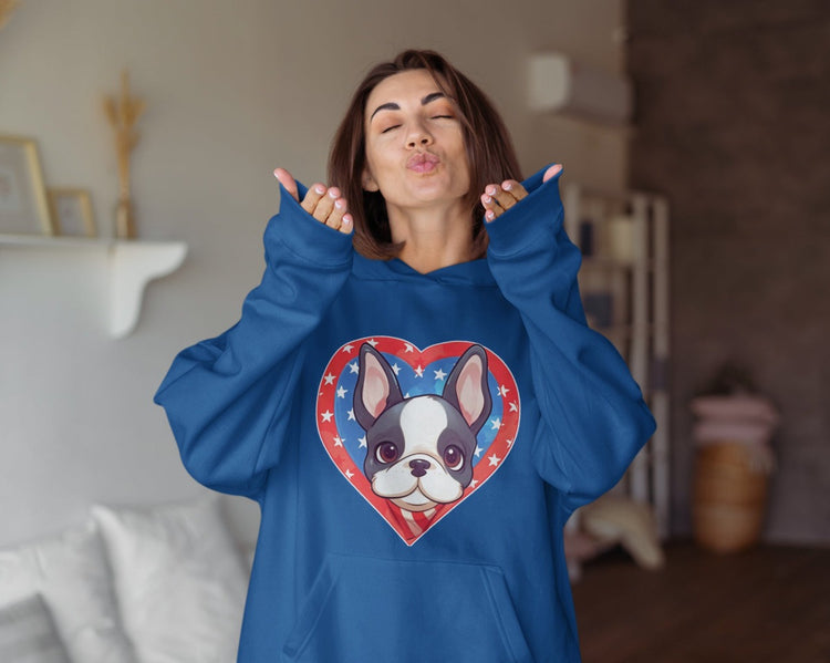 This hoodie sweatshirt features the cutest Boston Terrier face with a heart in the background colored in the patriotic hues of the US flag. Complete with vibrant red, white, and blue, as well as stars adorning the design, it's the perfect hoodie to celebrate the spirit of the 4th of July.