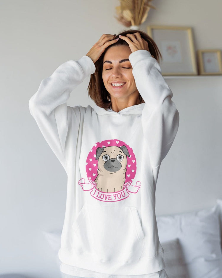 Whether you're taking your Pug for a walk, spending a cozy day at home, or simply want to showcase your love for Pugs, our "I Love You Pug" Women's Cotton Fleece Hoodie Sweatshirt is a must-have addition to your wardrobe.