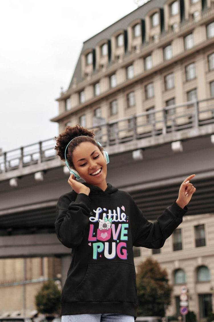 The highlight of this hoodie is the cute Pug design that steals hearts. A lovable Pug, brimming with personality and charm, graces the front, accompanied by the words "Little Love Pug" in bold, pastel-colored letters, adding a touch of sweetness to the overall look.