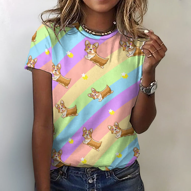 Step into a world of color and whimsy with our Magical Rainbow Corgis All Over Print Women's Cotton T-Shirt.