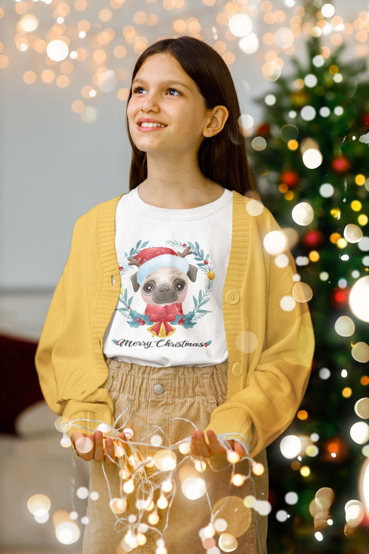 Made from high-quality cotton fabric, this t-shirt offers superior comfort, breathability, and durability for everyday wear. The highlight of this t-shirt is the adorable design featuring a Pug wearing a red Santa hat and reindeer horns, nestled inside a Christmas wreath adorned with a red ribbon bow and golden bells.