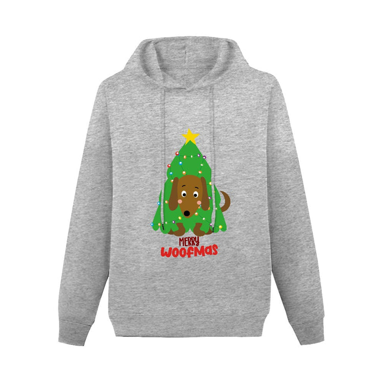 This hoodie features the cutest Dachshund dressed up as a Christmas tree, complete with a golden star on top. The adorable design captures the joyful spirit of the holiday season and will bring smiles to everyone's faces. Below the Dachshund, you'll find the cheerful text "Merry Woofmas," adding an extra dose of holiday cheer.