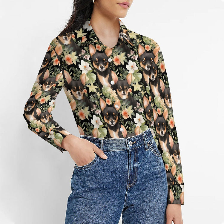 This women's shirt features an intricate and vibrant painting that magnificently captures the essence of the Chihuahua breed. With their distinctive large eyes, pointed ears, and petite snouts, the Chihuahuas take center stage. Complementing their playful presence is a meticulously designed array of colorful flowers, which add a burst of vivacity to the composition.