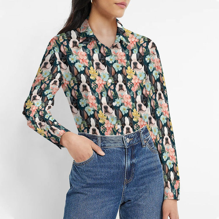 Step out in style and vibrant color with our Moonlight Flower Garden Boston Terriers Women's Shirt.