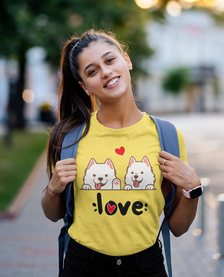 This adorable t-shirt features two super cute American Eskimo Dogs, with the word "love" written below them and a heart floating above. It's a design that will melt your heart and bring a smile to your face. Each time you wear this t-shirt, it will remind you of the special bond you share with your American Eskimo Dog, filling your day with happiness.