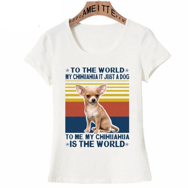 Image of a Chihuahua t-shirt featuring a cutest Chihuahua and the text which says "To the World My Chihuahua is just a dog. To me, my Chihuahua is the World"
