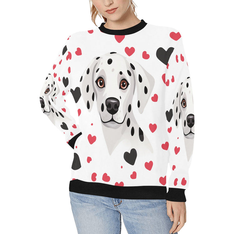 This sweatshirt isn't just cozy; it's a tribute to all Dalmatian enthusiasts who understand the joy and love that comes with having such a unique furry friend. Featuring a most adorable design with Dalmatians illustrated amidst red and black spotted hearts, the sweatshirt speaks directly to the essence of this vibrant breed known for its distinctive spots.