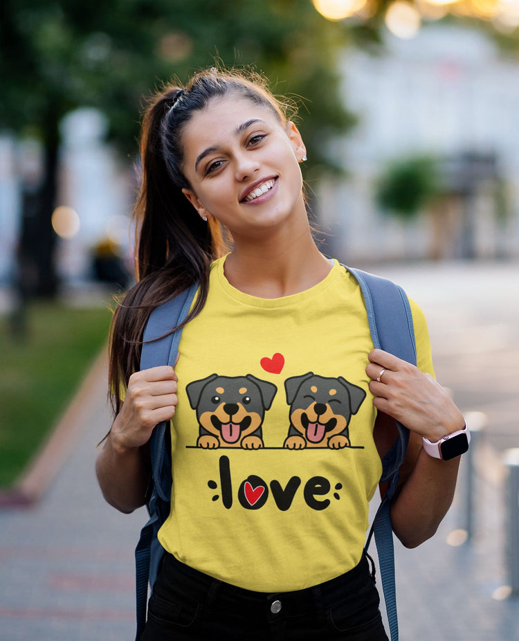 This adorable t-shirt features two super cute Rottweilers, with the word "love" written below and a heart floating above. The design is incredibly cute and captures the affectionate nature of Rottweilers. Every time you wear this t-shirt, it will bring a smile to your face and remind you of your deep bond with these amazing dogs.