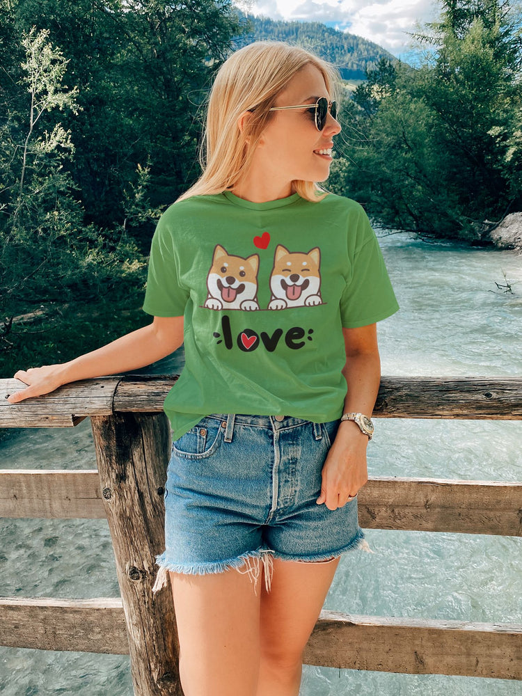 This delightful t-shirt features two super cute Shibas, accompanied by the word "love" and a floating heart. The design is incredibly charming, capturing the irresistible essence of these spirited dogs. Wearing this t-shirt will bring you joy each time, as it represents the special bond you share with Shiba Inus.