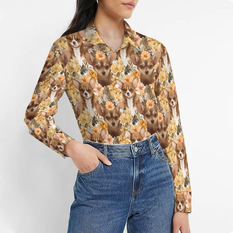 Step into a vibrant world of playful charm with our Orange Blossoms and Chocolate Chihuahuas Women's Shirt, available in three enchanting designs.