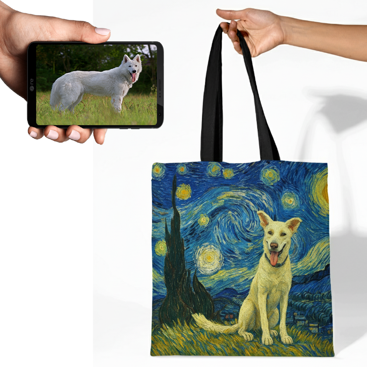 Personalized Starry Night Artwork White Swiss Shepherd Canvas Tote Bags