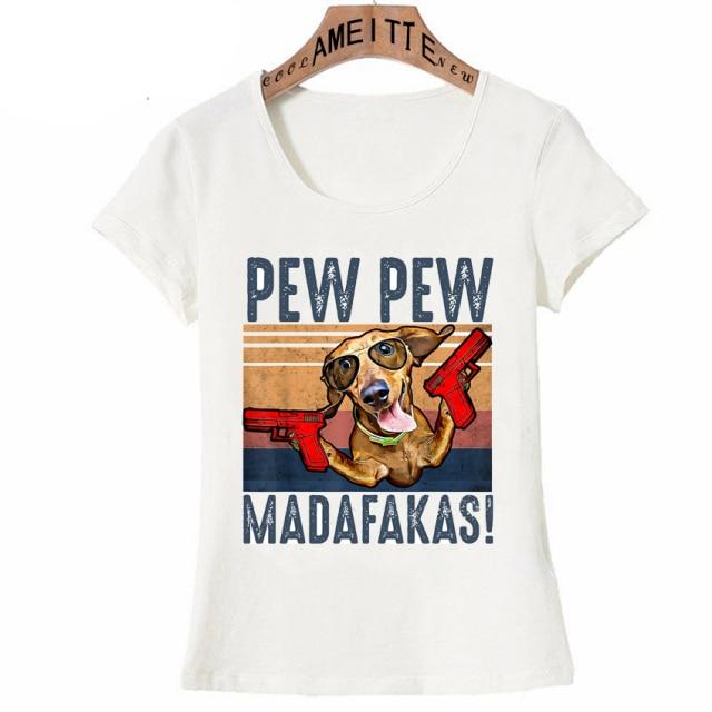 These hilarious pew pew red Dachshund t-shirts get us grinning each time!