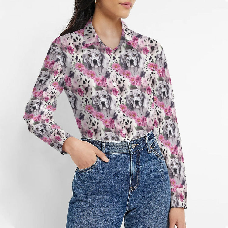 This unique shirt features an intricate painting of an adorable Dalmatian enveloped by delicate pink flowers. Designed to captivate, the shirt melds the Dalmatian's iconic spots with a beautiful smoky pink effect and pastel florals, creating a seamless and magical design. Just like Dalmatians are known for their playful and energetic nature, this shirt brings a youthful and vibrant energy to any ensemble.