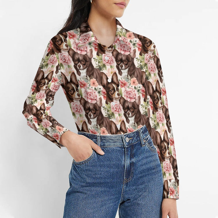 Unleash your love for Chihuahuas with our Pink Petals and Chocolate and White Chihuahuas Women's Shirt, available in 2 mesmerizing designs.