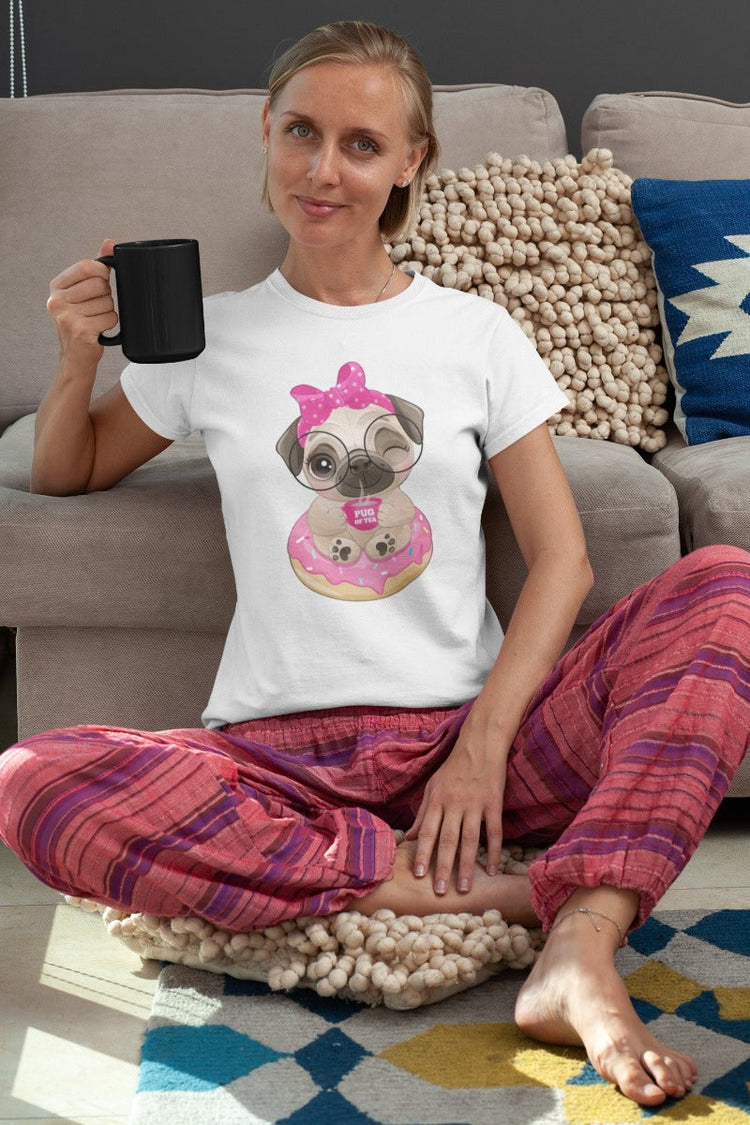The centerpiece of this design features a lovable Girl Pug sitting gracefully on a scrumptious strawberry donut. Holding a delightful tea cup that says "Pug of Tea," this adorable Pug encourages you to take a moment for yourself, relax, and enjoy the simple pleasures in life.