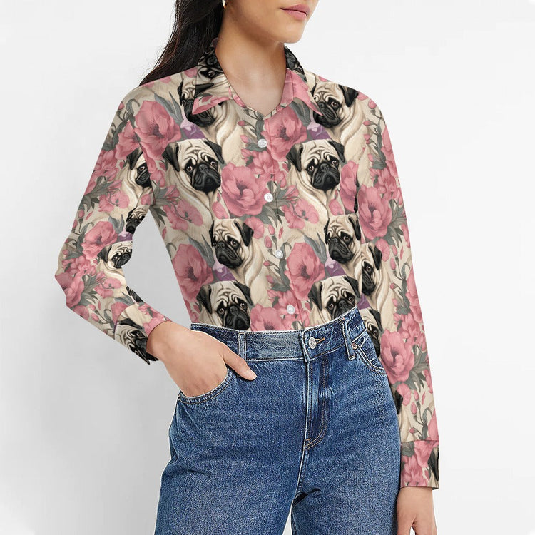 Immerse yourself in a whimsical world with our Pugs and Pink Petals Women's Shirt, a fashion statement that brings together the joyous character of Pugs and the gentle charm of floral beauty.