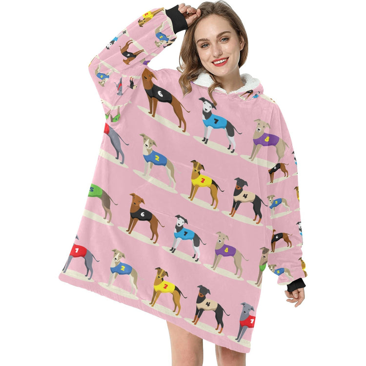 This cozy blanket hoodie is a celebration of the sleek and graceful Greyhounds and Whippets, known for their agility and speed. It features adorable illustrations of these dogs, all geared up and ready for the races, making it a delightful piece for any dog lover. Available in four fashionable colors - Pink, Blue, Green, and Gray, there's a hue to suit every style.
