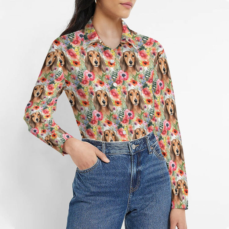 Experience the charming blend of canine grace and natural beauty with our Red Dachshunds in Floral Harmony Women's Shirt.