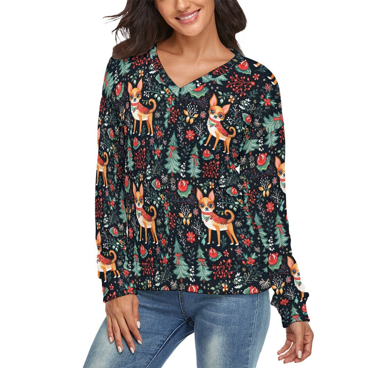 Red / Fawn and White Chihuahua Christmas Elegance Women's V-Neck Christmas Sweater