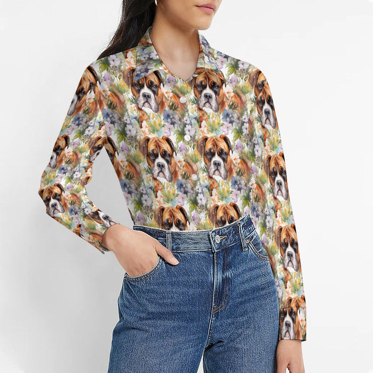 Embrace the enchanting blend of nature and canine grace with our Watercolor Flower Garden Boxer Women's Shirt.