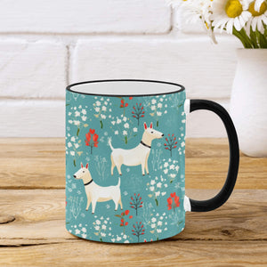 The crisp white coat of the terrier beautifully contrasts with the soft teal background, creating an eye-catching aesthetic. Adorned with sprigs of white and red flowers, this mug is a perfect expression of love for your furry friend.