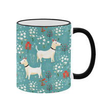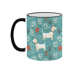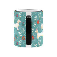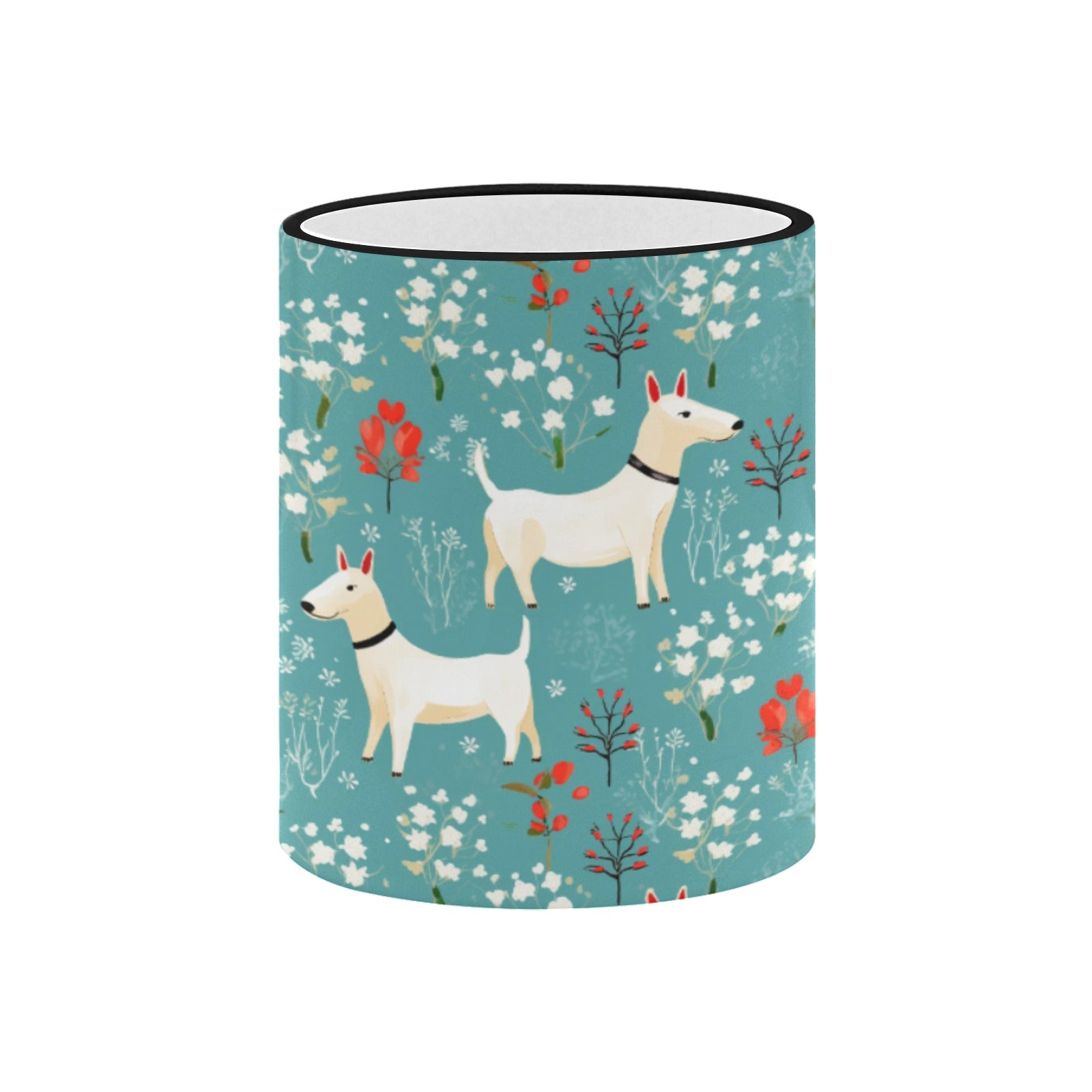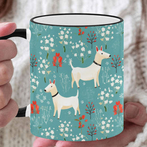 This delightful mug captures the playful spirit of the White Bull Terrier, set against a vibrant springtime meadow.