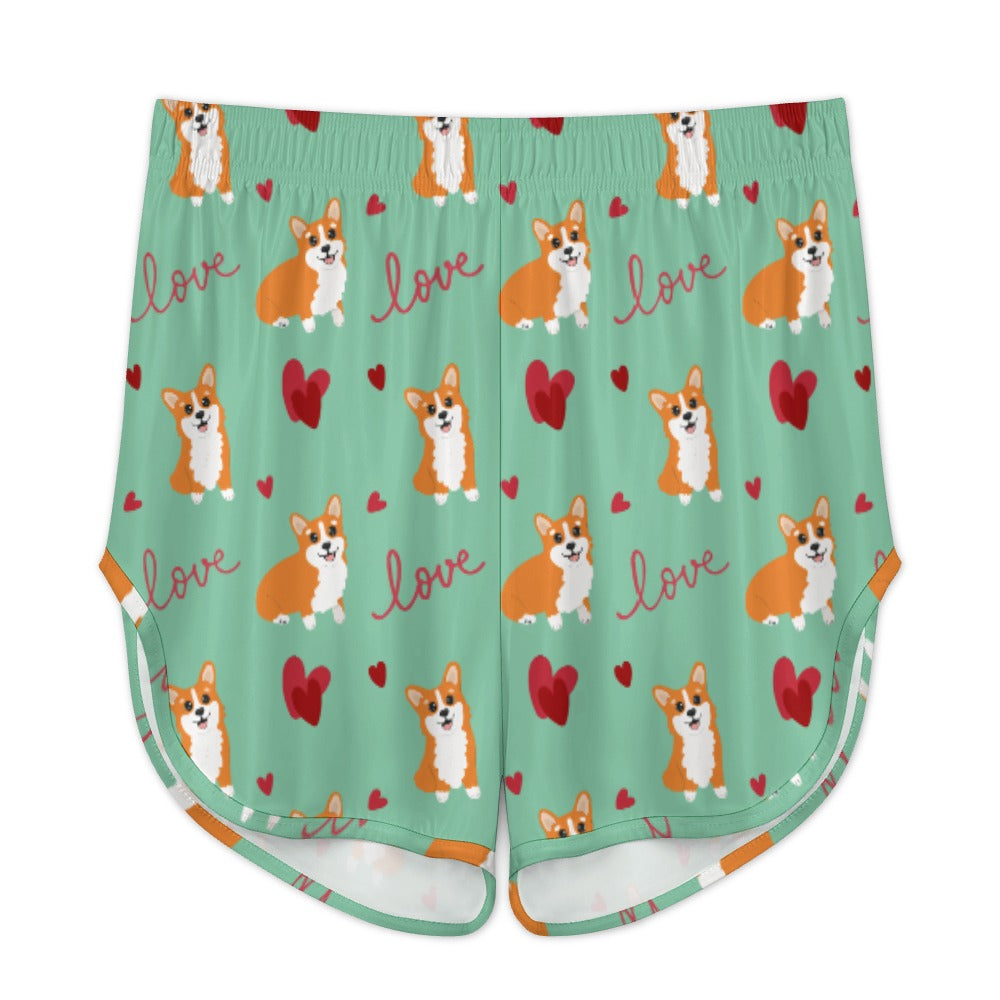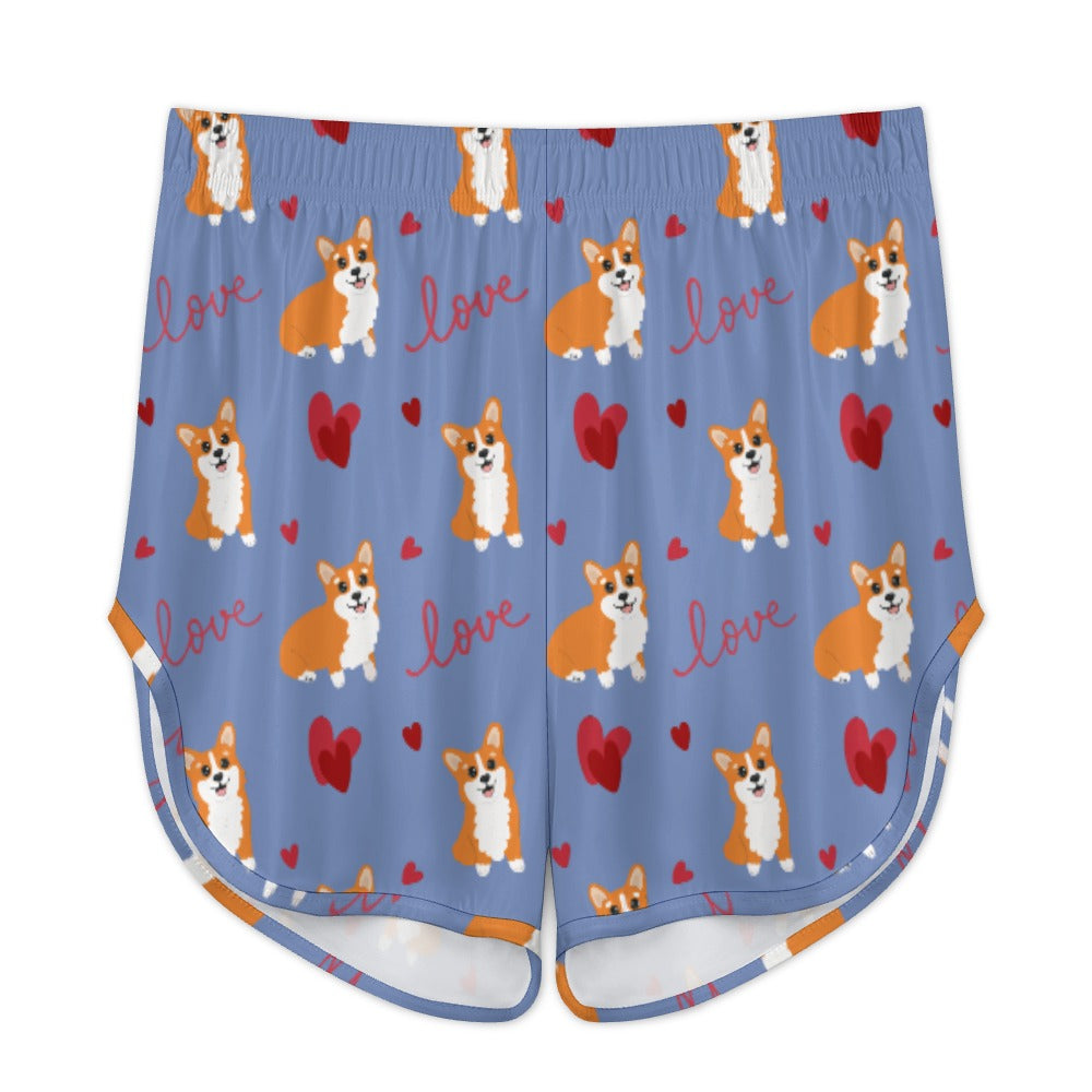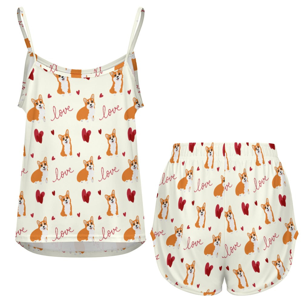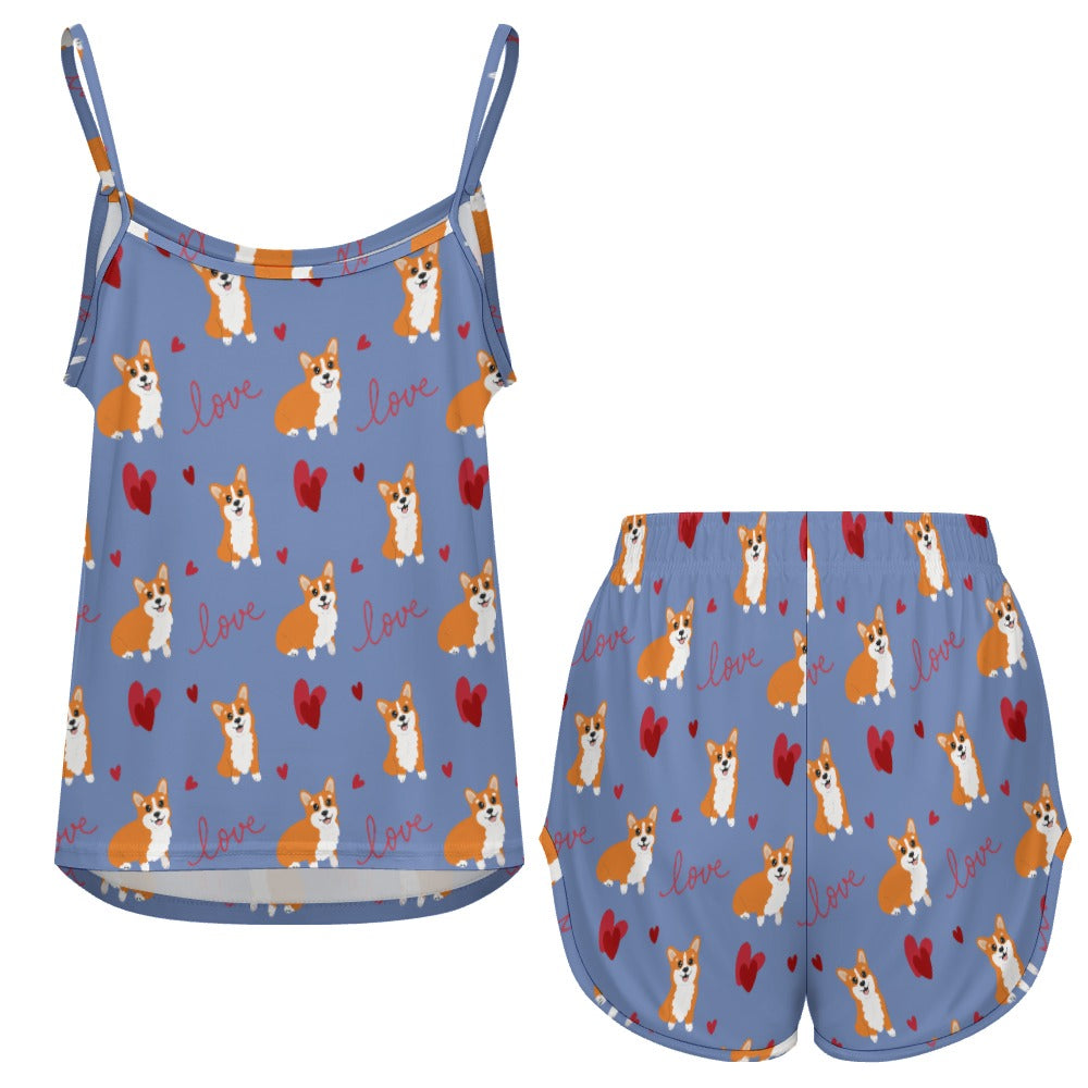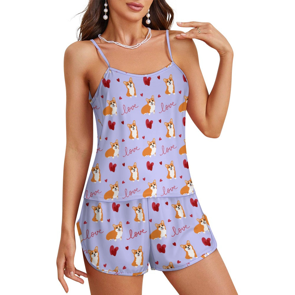 Celebrate your love for Corgis with our charming Women's Cami and Shorts Pajama Set! This delightful set features the cutest Corgis surrounded by red hearts and expressions of love, perfectly capturing the affection you have for these adorable companions.