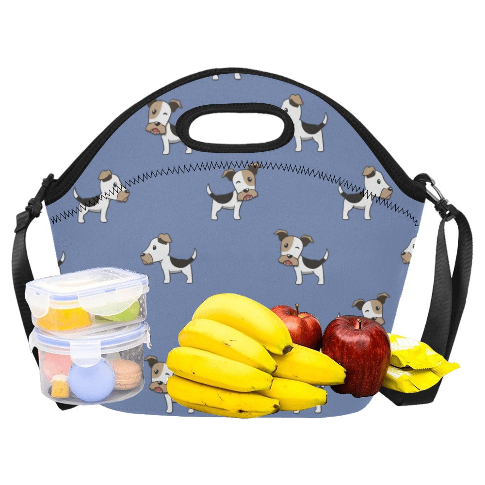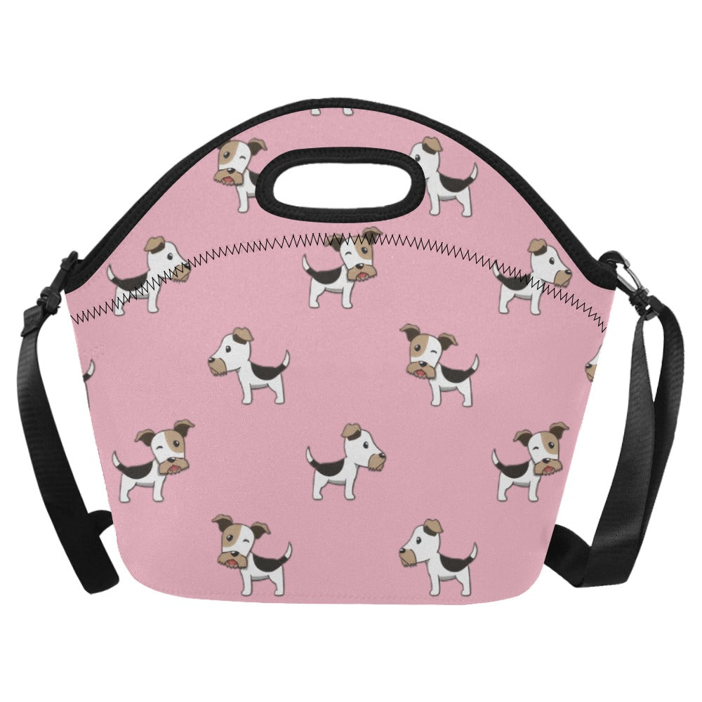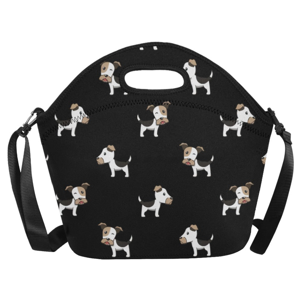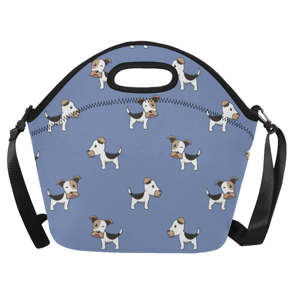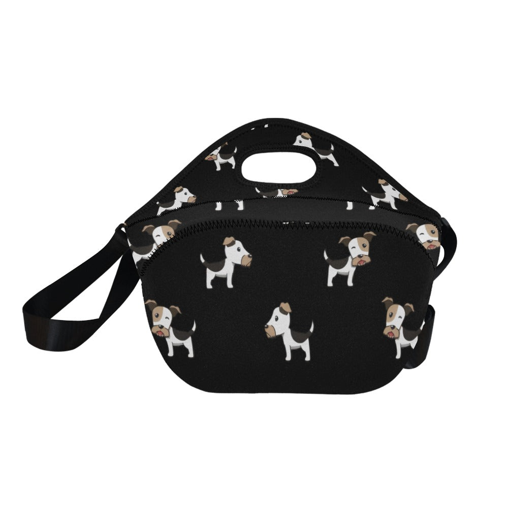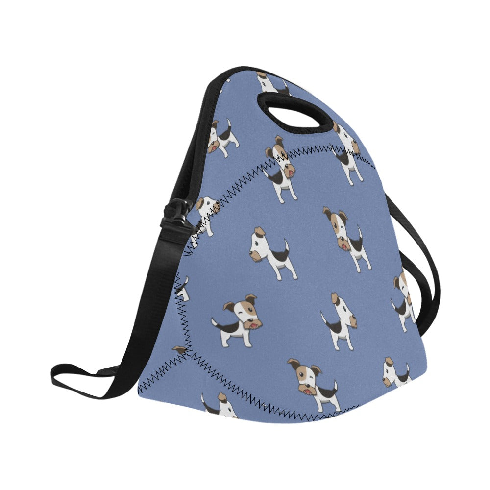 Bring joy to your lunchtime with our Energetic Winking Fox Terrier Neoprene Lunch Bag, a delightful companion for every meal. This charming bag features a lively pattern of cartoon Fox Terriers, each showcasing their spirited personality in playful poses.