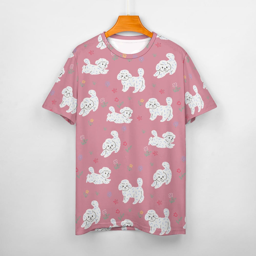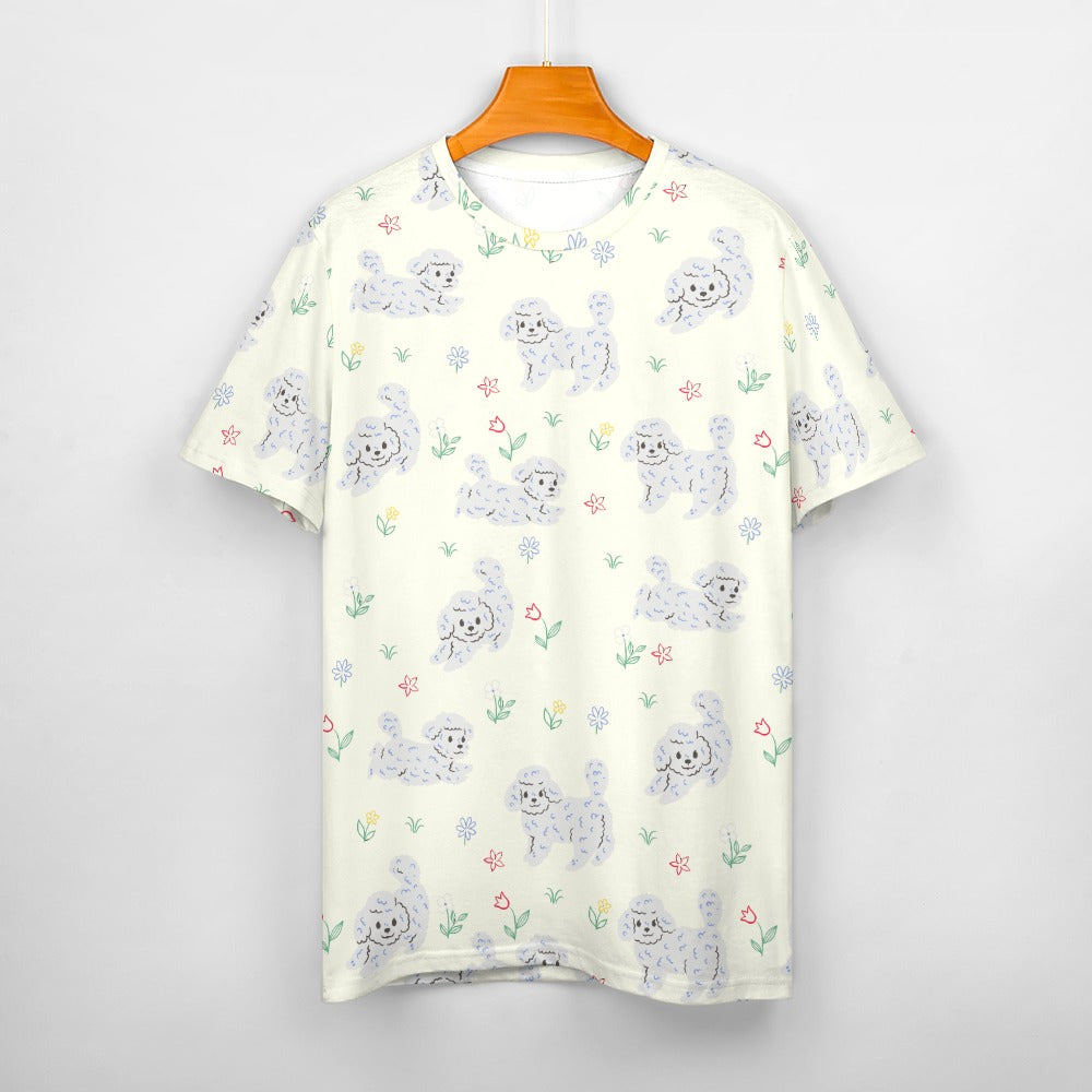 Express your love for your Poodle with our enchanting Playful Poodles in a Garden Stroll Women's Cotton T-Shirt.