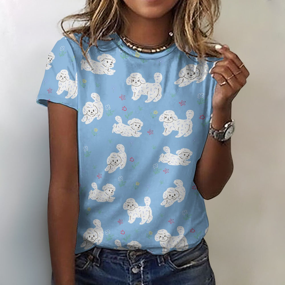 Playful Poodles in a Garden Stroll Women's Cotton T-Shirt-Apparel-Sky Blue-2XS-15