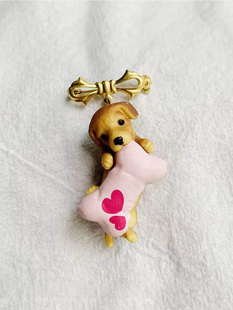 This charming accessory features a sweet puppy figurine hugging a soft pink bone, adorned with two heart shapes, perfect for dog lovers everywhere.