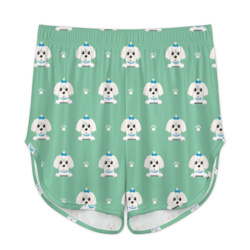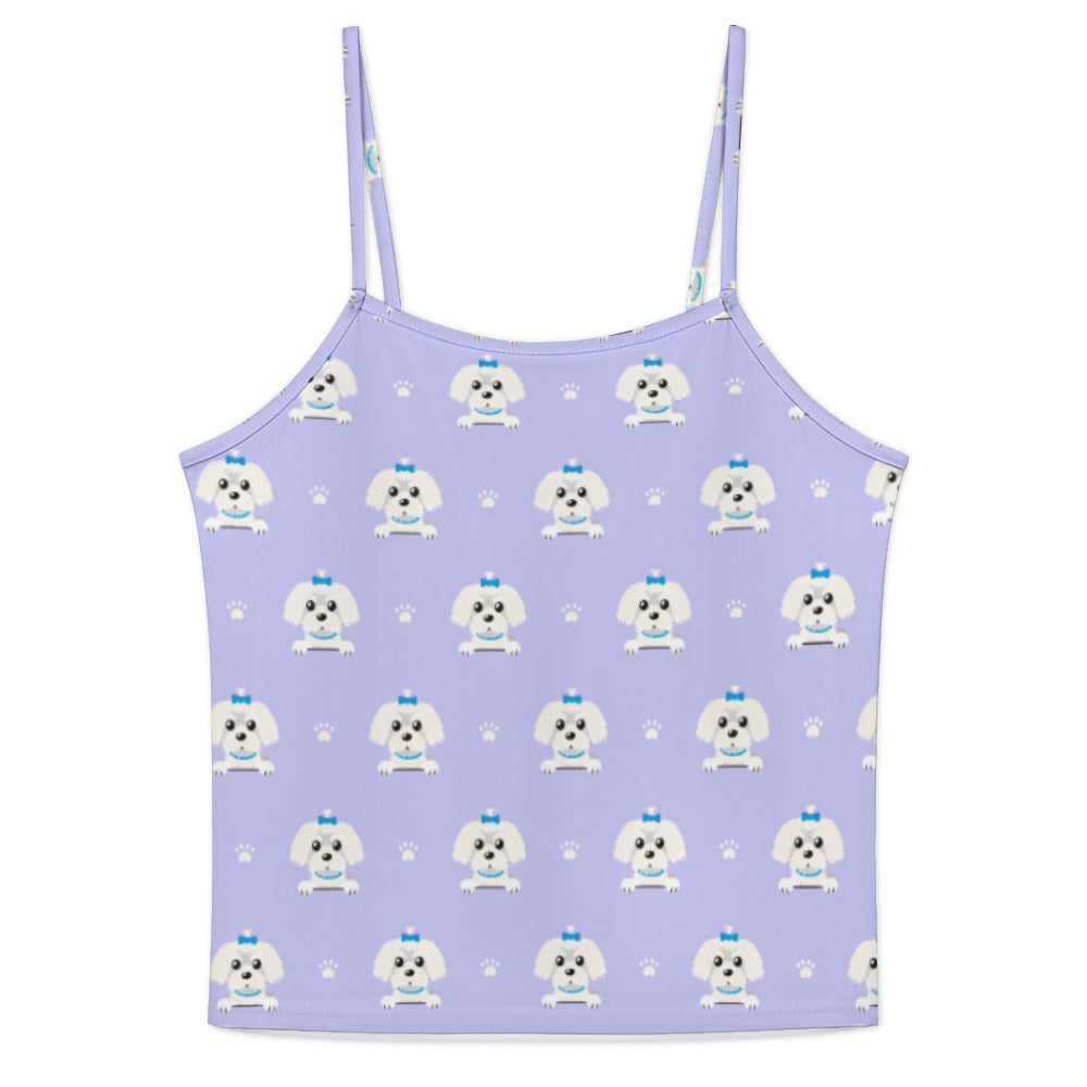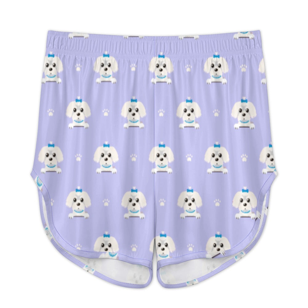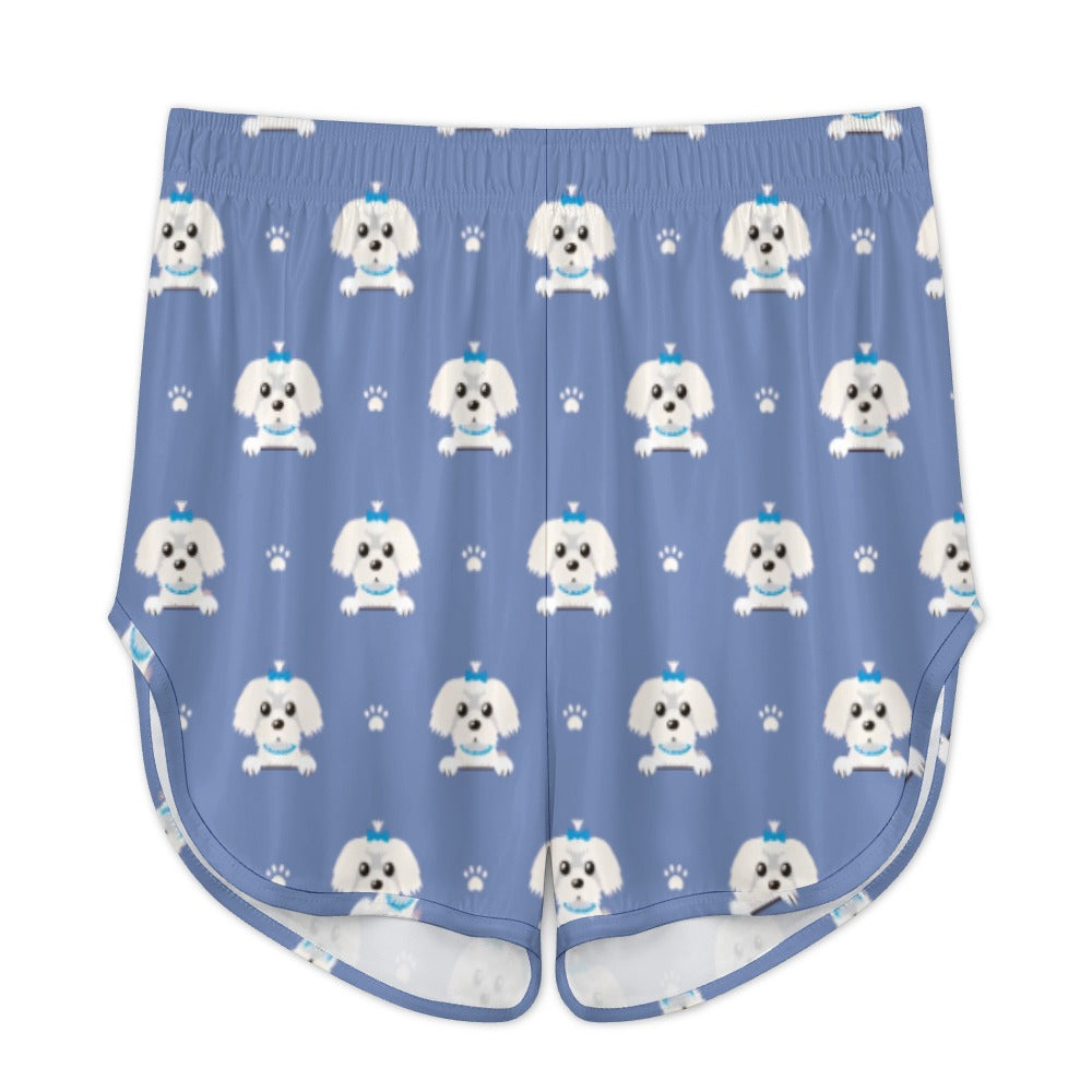 Indulge in comfort and style with our Elegant Maltese Puppy Women's Cami and Shorts Pajama Set, perfect for cozy nights in. This delightful set features a charming design of cartoon Maltese dogs, each adorned with fluffy white coats and sweet blue bows, bringing joy to your loungewear collection.