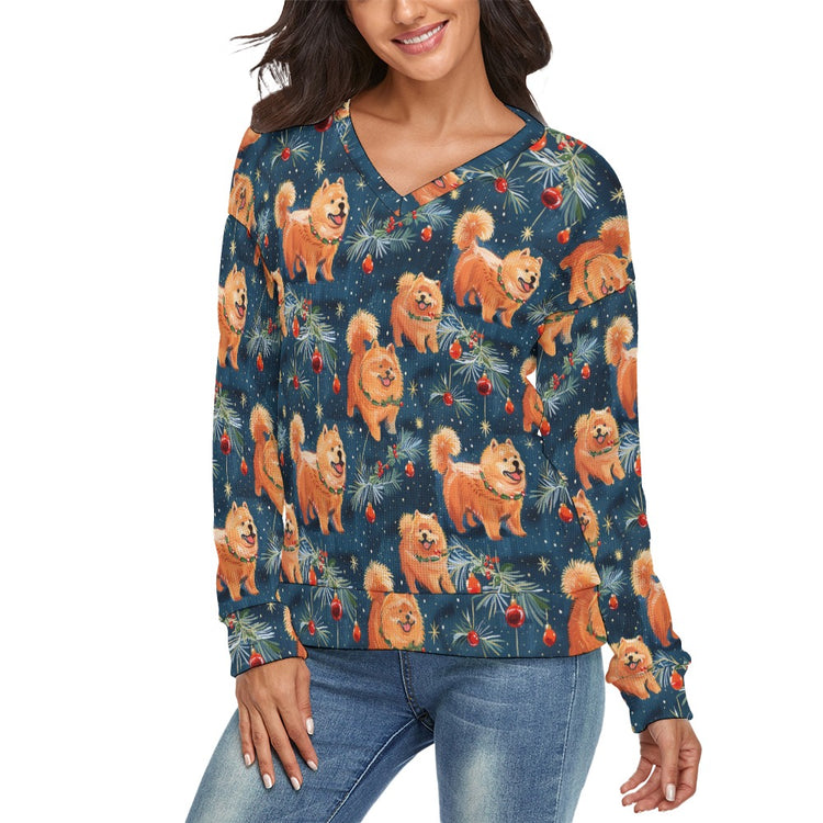 Festive Fluff Chow Chow Women's V-Neck Christmas Sweater