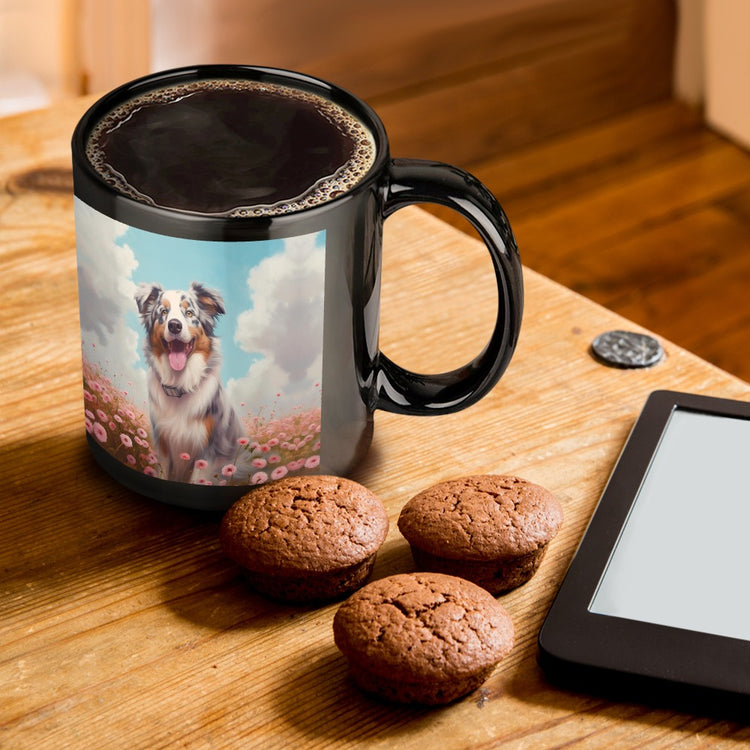 This exquisite mug features a stunning portrayal of an Australian Shepherd surrounded by delicate daisies, capturing the essence of companionship and nature's beauty.