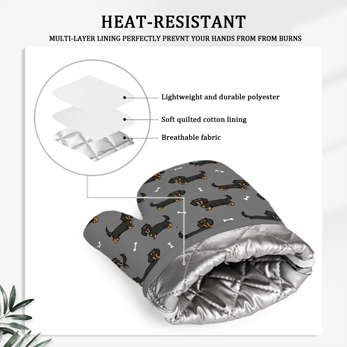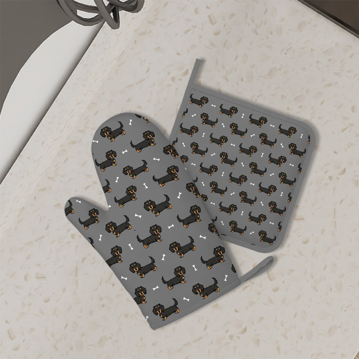 Bring joy to your kitchen with our Cutest Long Haired Black Tan Dachshund Oven Mitts and Pot Holders Set!