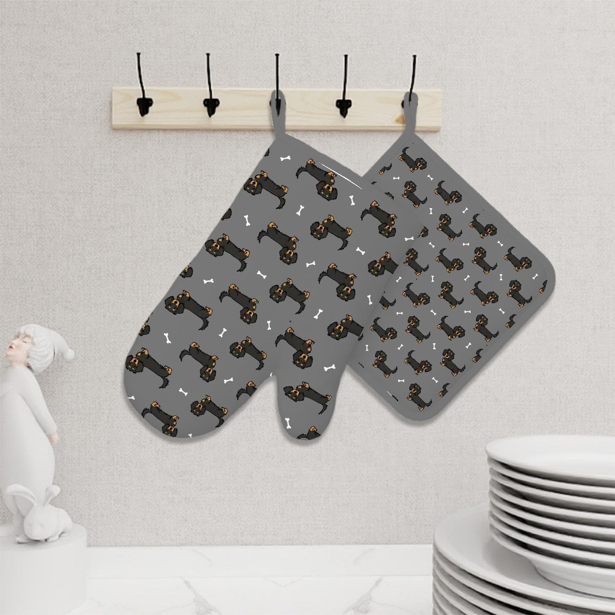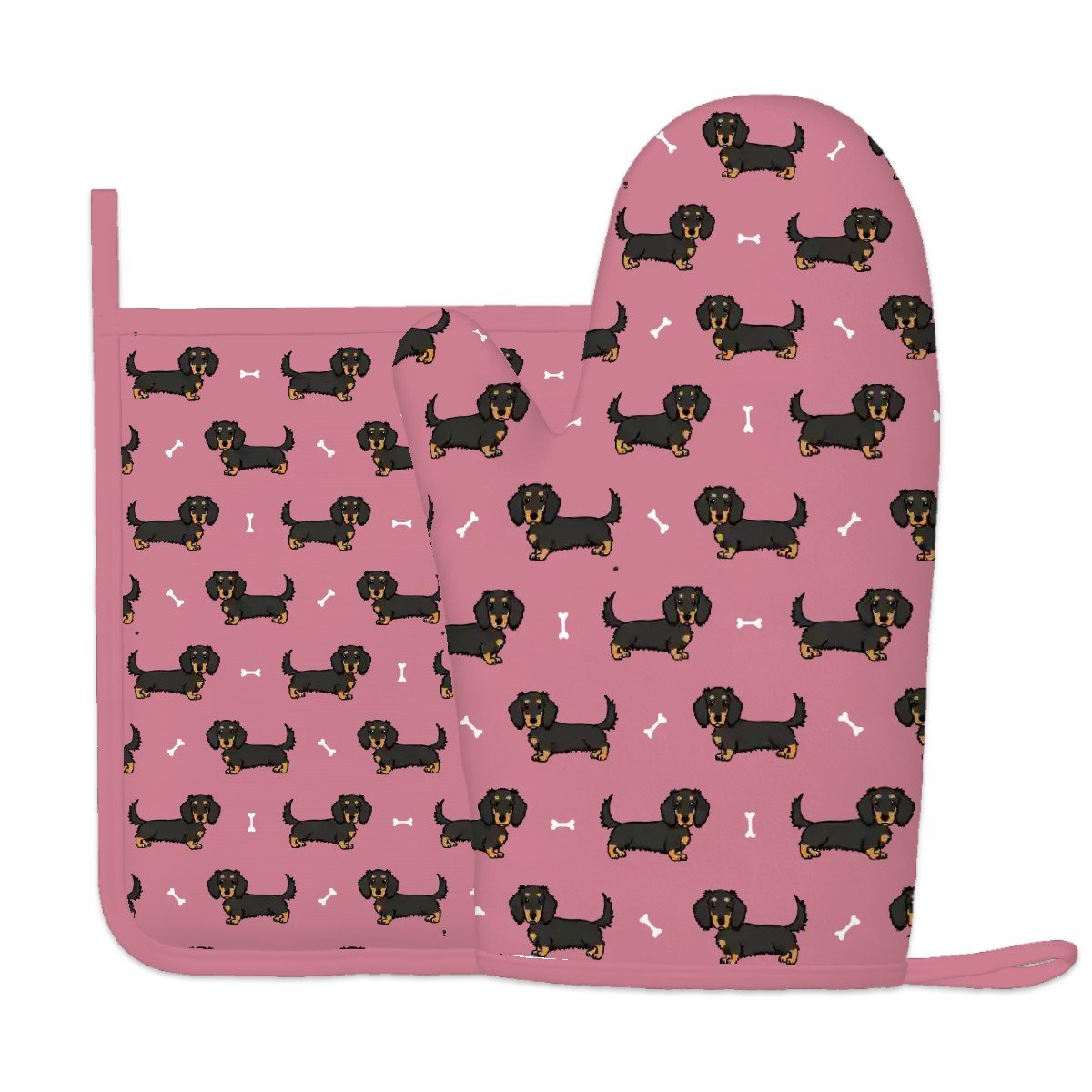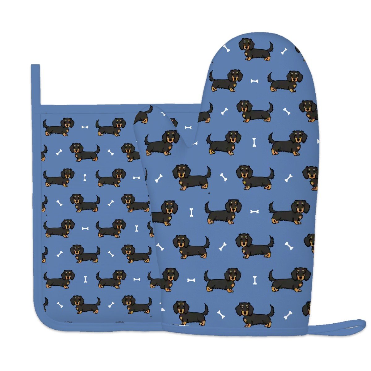 Long Haired Black Tan Dachshund Oven Mitts and Pot Holder Set