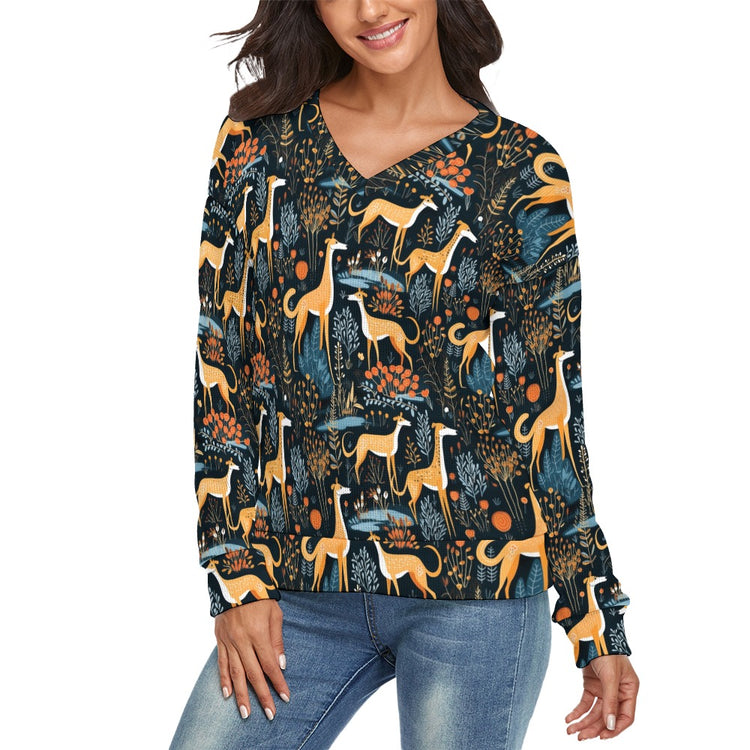 Midnight Garden Whippet Women's V-Neck Christmas Sweater