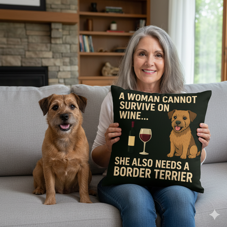 Celebrate the perfect blend of wine and your beloved Border Terrier with our personalized pillowcase! This unique piece features the charming phrase: “A Woman Cannot Survive on Wine Alone… She Also Needs a Border Terrier.”