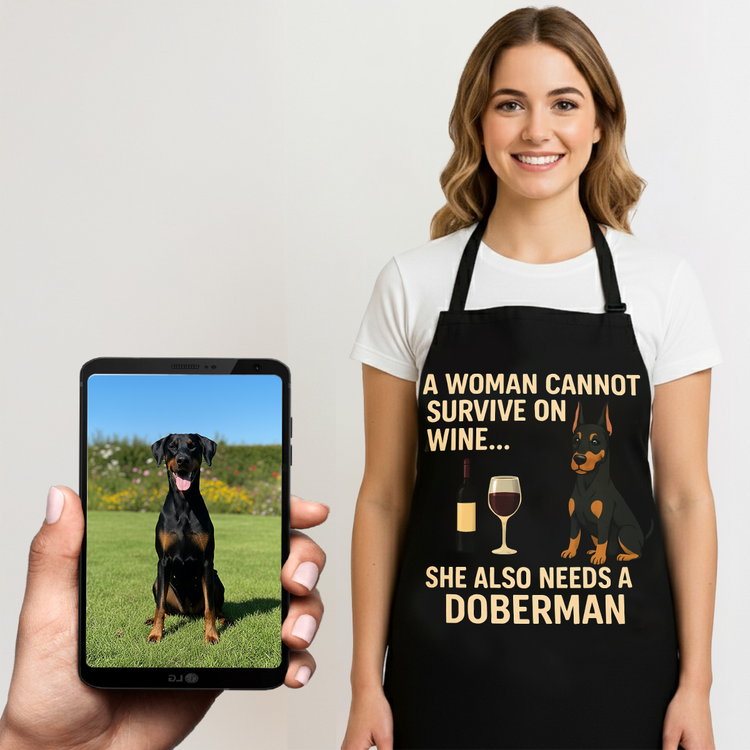 Celebrate your love for your furry friend with our Personalized “A Woman Cannot Survive on Wine Alone… She Also Needs a Doberman” Custom Dog Apron. This unique apron is perfect for dog lovers who enjoy cooking or entertaining while showcasing their bond with their beloved breed.
